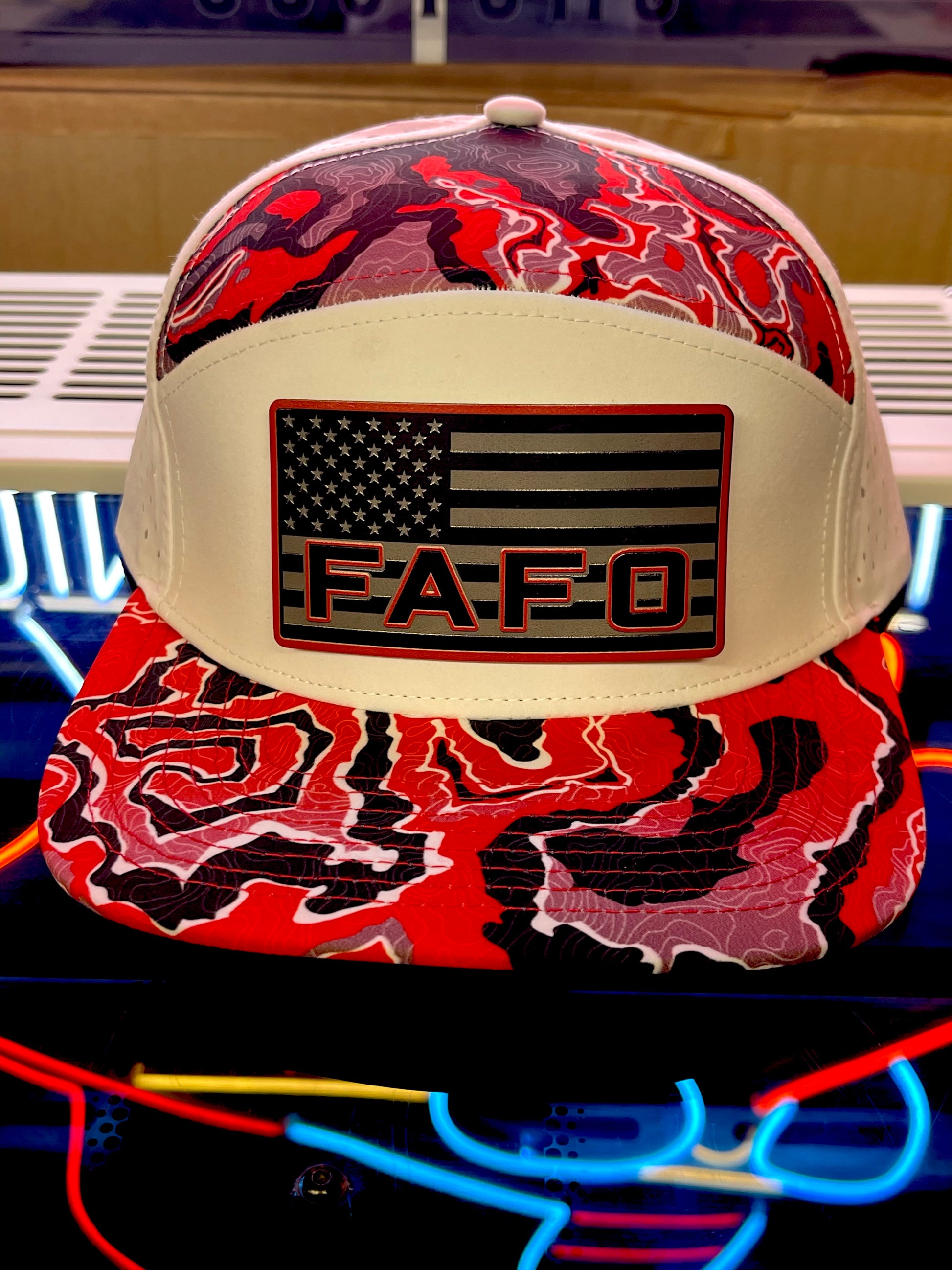FAFO Hat – American Flag Black/Red Patch on White/Red Camo Snapback | Patriotic Tactical Cap