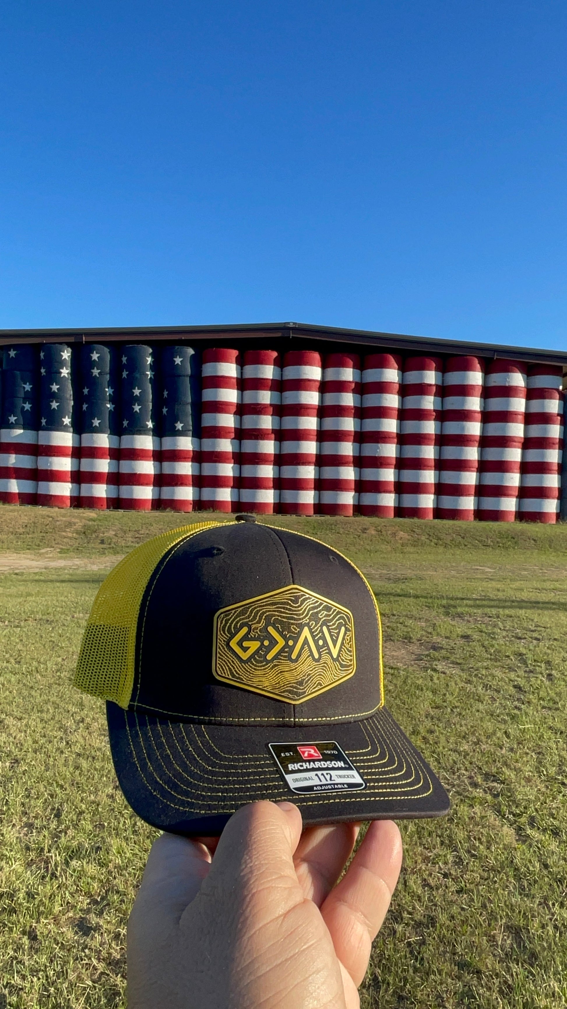 God is Greater Than the Highs and Lows Hex Topographic Patch Hat Yellow & Black Richardson 112 Trucker Pointer Tactical Customs