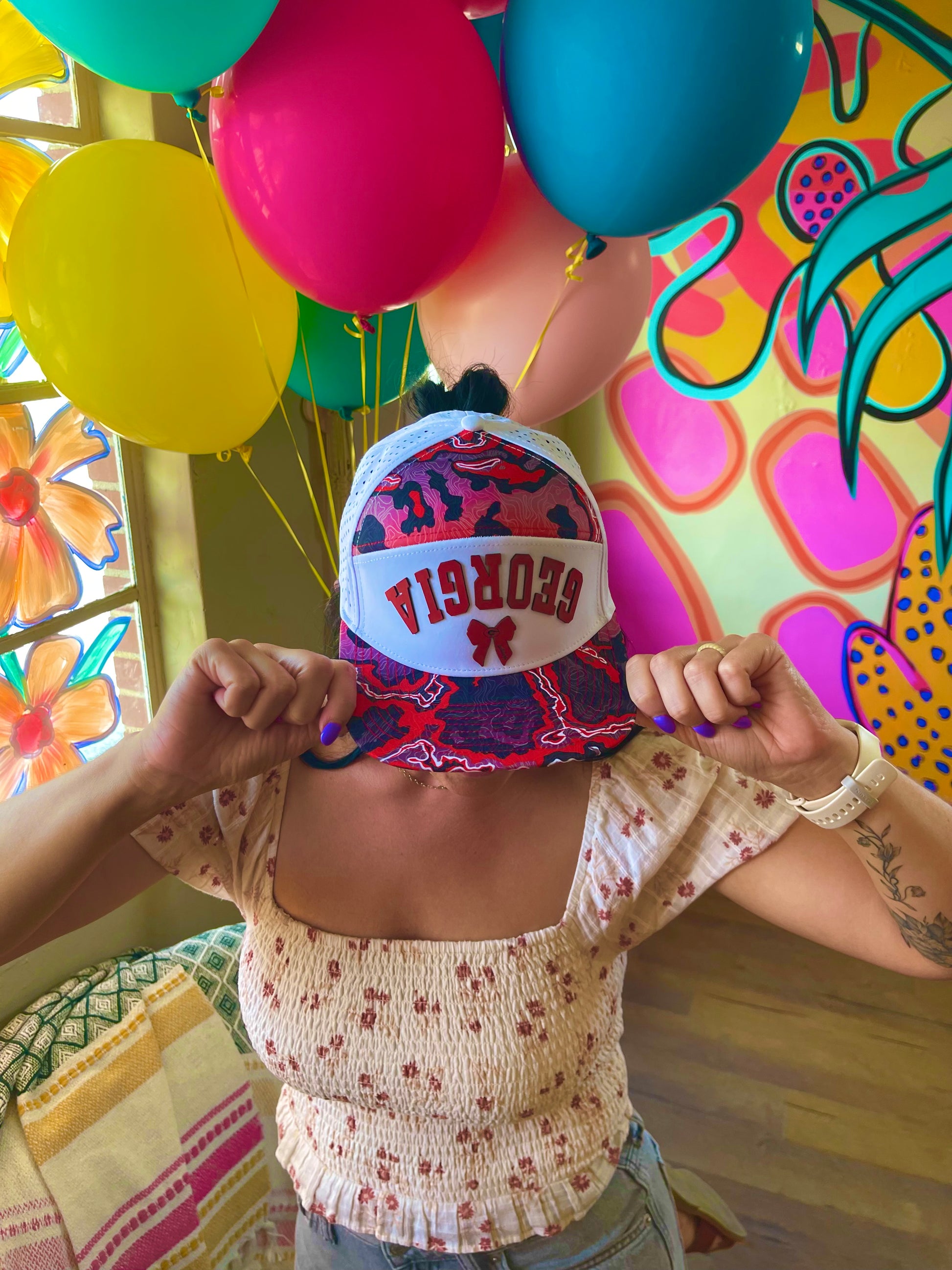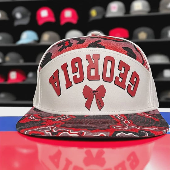 bold reverse "GEORGIA" design features a custom red camo brim and snapback